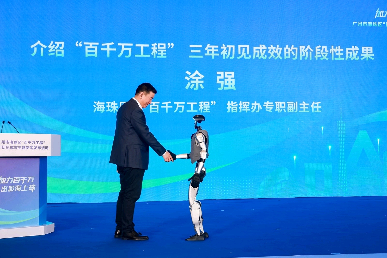 10月30日,琶洲,一台机器人缓缓滑向舞台中央,机械臂精准伸出,与海珠区“百千万工程”指挥办相关负责人完成象征性的握手。