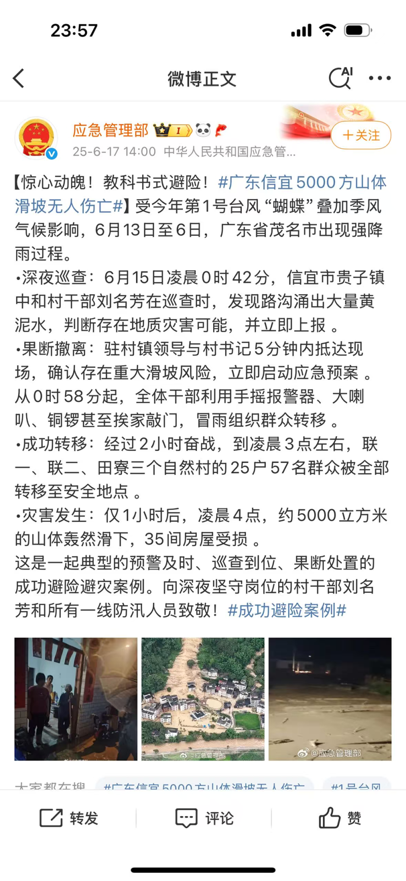 这场零伤亡的茂名滑坡避险案例获应急管理部通报表扬。公开报道显示,应急管理部风险监测和火灾综合防治司指出,这是一起典型的预警及时、巡查到位、果断处置的成功避险避灾案例。现特对广东省应急管理厅、茂名市应急管理局、信宜市应急管理局,贵子镇、中和村及刘名芳等予以通报表扬。