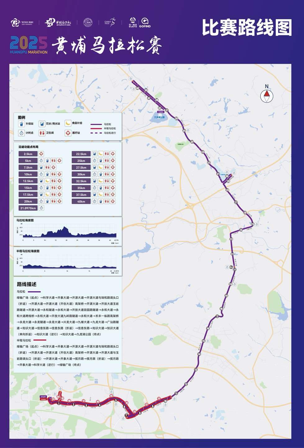 选手们将从代表黄埔现代产业与创新心脏的科学城绿轴广场启程。由此出发,赛道沿科学大道、开源大道等城市动脉延伸,其点睛之笔在于跑者将连续穿越永和隧道与永龙隧道。这一设计超越了地理连通的功能,同时象征着从底蕴深厚、产业成熟的科学城,向蓝图宏伟、面向未来的知识城的奋力跨越与能量传递。最终,全程选手将抵达知识城九龙湖广场冲线,完成一次从“科技创新策源地”到“未来城市示范区”的壮丽旅程。半程马拉松则通过巧妙的折返设计,更聚焦于科学城核心区的繁华景象与成熟配套,让跑者感受黄埔立足当下的坚实与活力。