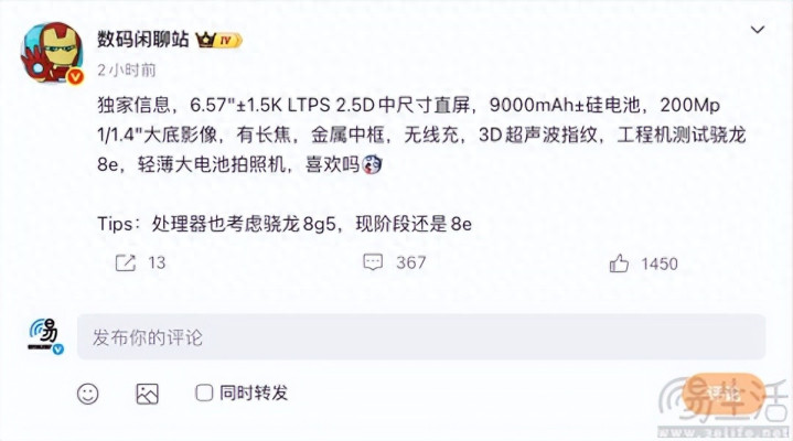 此次曝光的信息显示,这款新机或将采用一块具备1.5K分辨率的6.57英寸LTPS 2.5D中等尺寸直屏,并有望配备9000mAh左右的大容量电池,目前正在测试骁龙8至尊版,但也在考虑第五代骁龙8主控,此外还提供了无线充电、金属中框、3D超声波指纹识别等配置。影像方面除了1/1.4英寸2亿像素大底主摄外,同样有望提供长焦副摄。